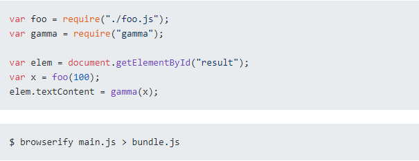 browserify致力于在浏览器端使用CommonJs,他使用跟 NodeJs 一样的模块化语法,然后将所有依赖文件编译到一个bundle文件,在浏览器通过标签使用的,并且支持 npm 库。