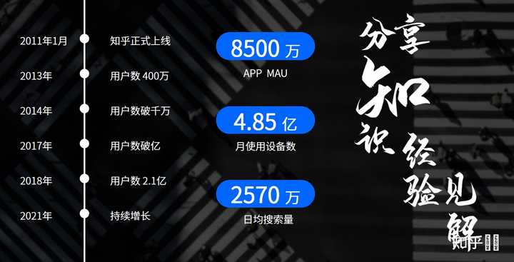 知乎,中文互联网高质量的问答社区和创作者聚集的原创内容平台,上线10年来,注册用户已经高达4.2亿,APP 月活量高达8500万,日均搜索量高达2570万,用户日均使用市场70分钟,黏性非常强。