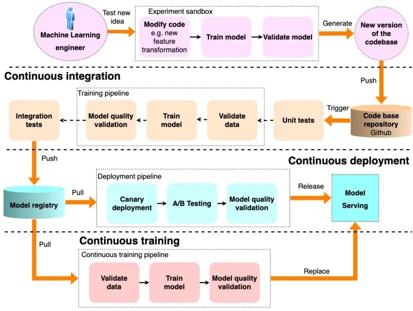 MLOps的核心思想是将DevOps的流程和工具应用于机器学习领域,以实现机器学习应用的持续集成、持续交付和持续部署。MLOps的目标是通过使机器学习的开发、测试和部署更加自动化来增强软件开发的效率和质量。