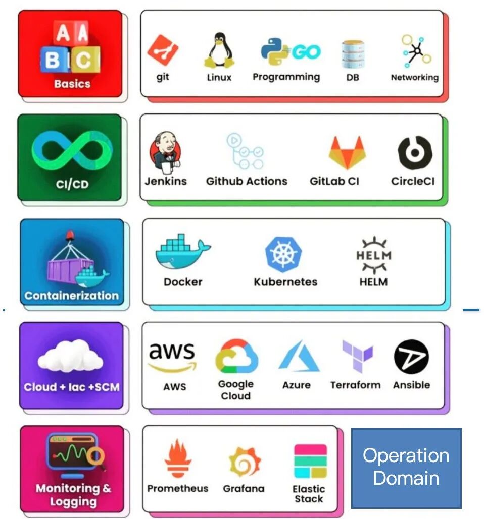 DevOps 涉及了技术、组织、文化等多个领域,就相关技术技能而言, 大约包括以下几个层次: