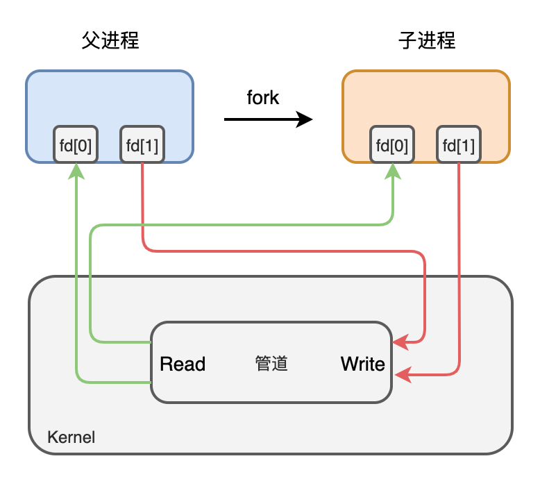 这俩盯着手册上的两个图研究了半天,总算弄明白了,所谓匿名管道不过是内核中的一段缓冲区,提供了读写两个口子,通过fork创建子进程后,子进程继承了父进程的管道信息,两边只要约定好,一个读,一个写,就能实现通信了。