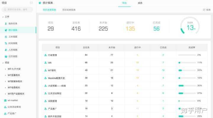 任务执行中的能力:能随时查看目前整个公司都有哪些项目,分别的当前进度情况,以及每个项目的时间节点;当然它也支持项目内统计和任务全局统计,报表也能根据需求进行自定义。