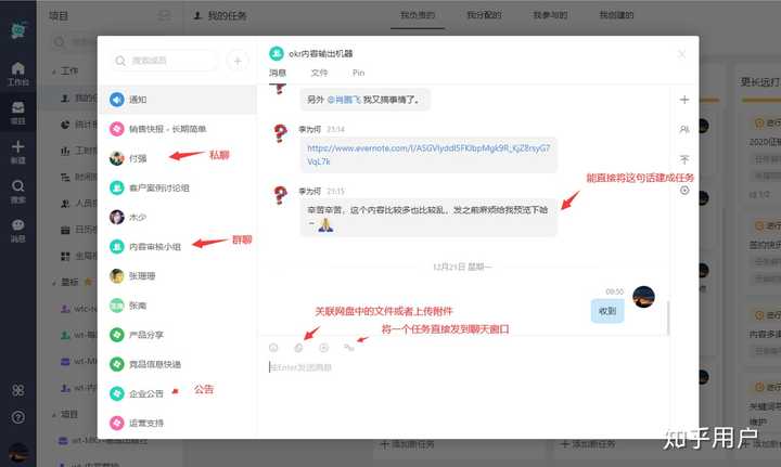 并且我们也经常基于某项任务建立群聊或者发起私聊,比起微信等更方便的是,能够任务和工作文件能够快速分享