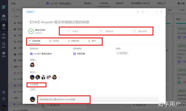 任务规划中的能力:通过下图大家也能看到,在任务建立过程中,Worktile支持指定负责人、优先级、开始结束时间、任务标签等任务属性设置;