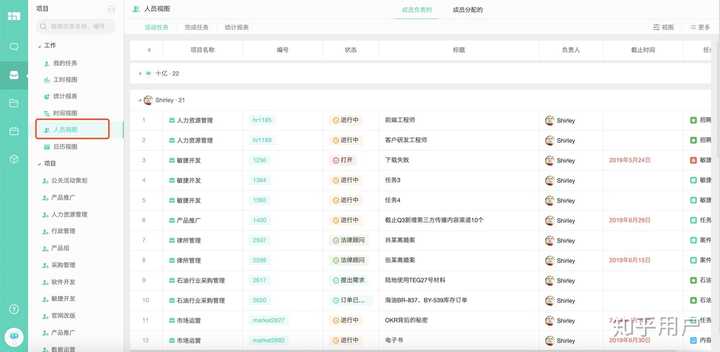 Worktile的人员视图可以查看每个成员负责的项目即进度情况。