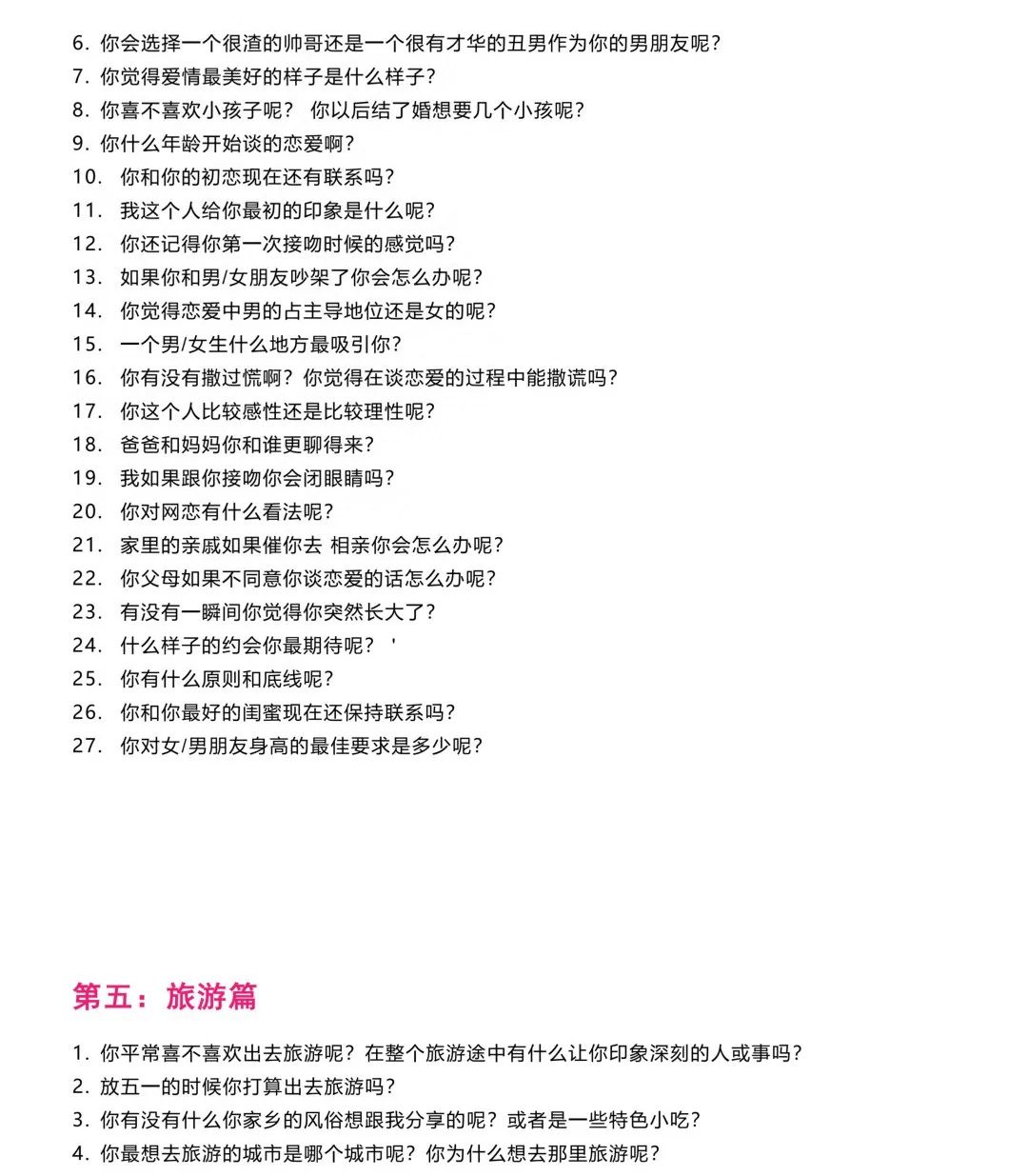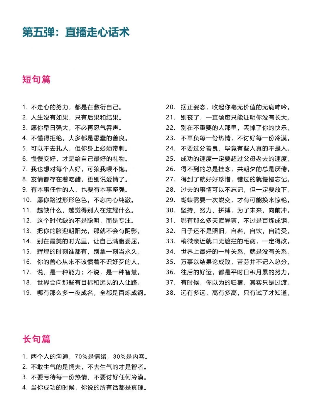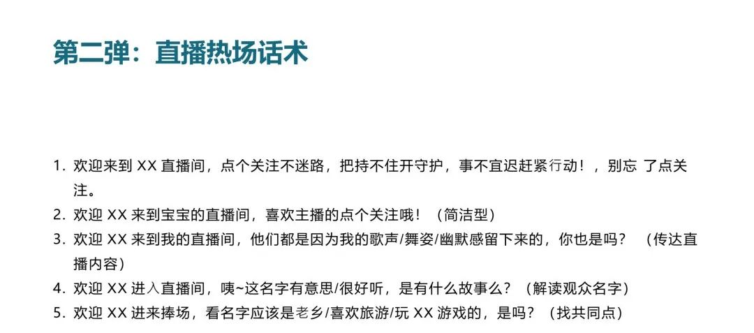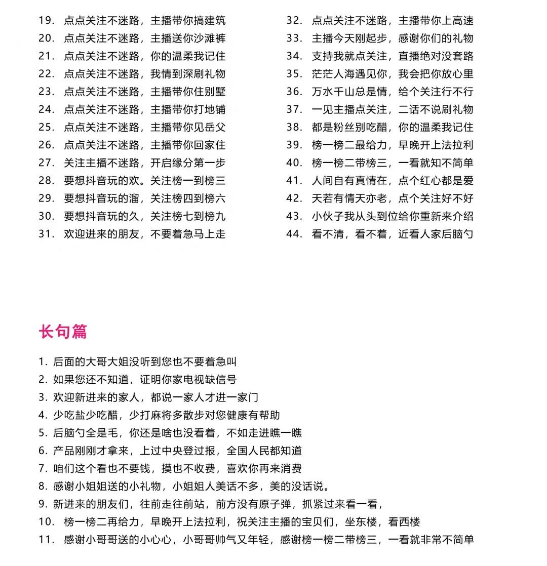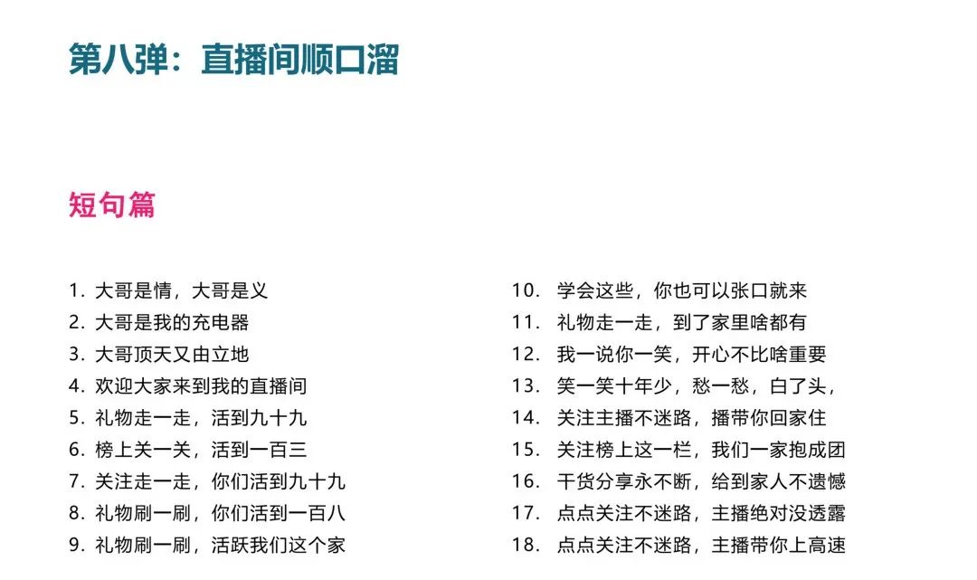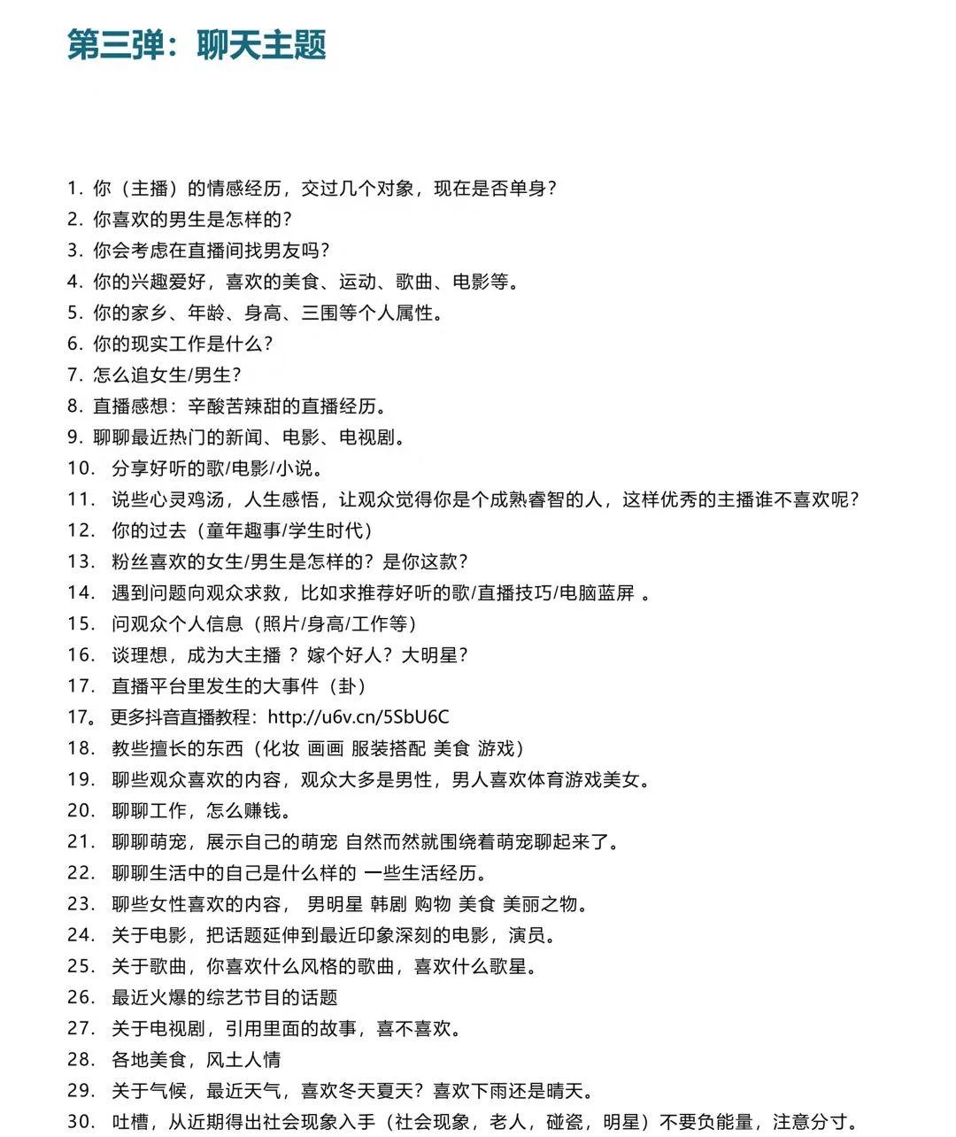 本文将从直播开场话术、直播互动话术、聊天主题、直播话题、直播走心话术、直播表白、拉近距离、直播间顺口溜、直播引导关注话术、直播结尾、直播如何提升关注率、直播间四大入口、提升直播间权重五大维度等板块详解!(点击图片可查看大图)