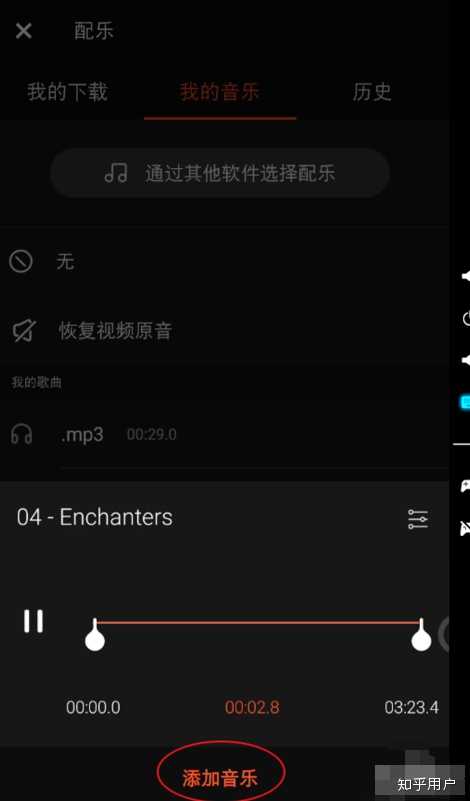在视频剪辑当中配乐以及转场极为重要,配乐就是视频的背景音乐,转场就是一个镜头到切换下一个镜头之间。第一步先添加配乐,点击高级编辑这里的多段音乐,然后进入下级菜单点击加号,会看到一个去处视频声音的选项,默认情况下是去掉了视频的录制声音的,需要的话点击一下即可恢复。接着点击我的音乐,软件会列出手机内的所有的音频。选取音乐后,会在音乐时间轴上面出现两个白点,拖动这个白点,然后进行修剪音乐的时长,根据自己的需要进行修剪,修剪完毕后点击添加音乐。继续添加音乐会再次添加多段的音乐。