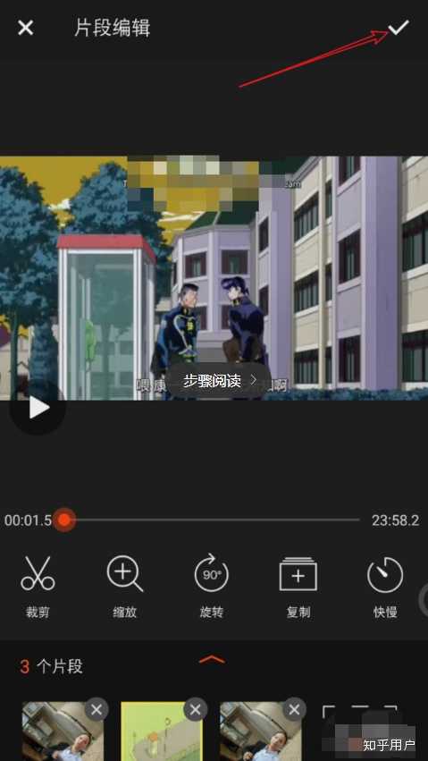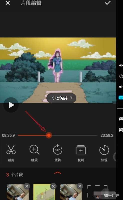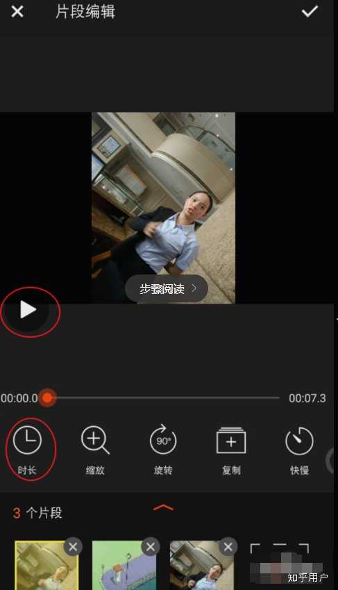 点击图片然后选择时长,进行合理的调整,此外APP还提供了缩放旋转复制快慢五个功能,这个根据自己的需要选择。原则上面每一个图片最好呈现不一样的效果,最好是配合音乐片段进行拉长。接着点击视频,然后点击修剪,修剪这里拖动两边的按钮,然后选取适合的位置的点击确定,再对底部的每一个视频进行快慢时长等的操作,这个能够将视频变得更加的生动。视频修剪完毕点击顶部的勾进行保存剪辑进度。