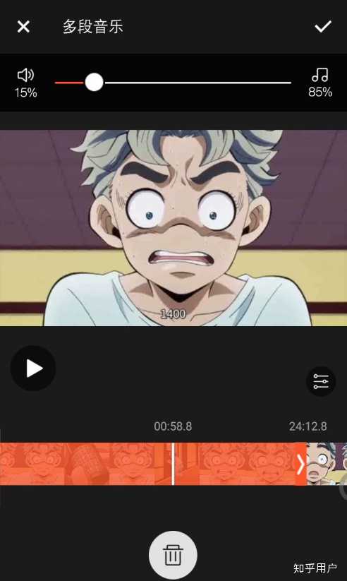 接着音乐会出现在视频的上面,显示的颜色橘色,这里在音乐开头结尾有两个箭头,拖动这个按钮可以进行精确的音频剪辑。而视频上方则是调整视频原声跟配乐的大小,越往左边视频原音越小反之越大。添加完毕则多段音乐点击右上角的勾,进行添加。