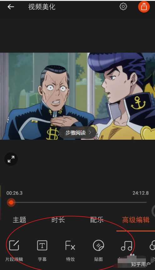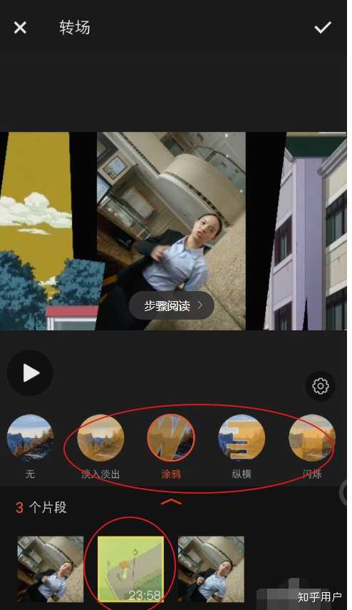 点击高级编辑,然后点击底部的转场按钮,进入转场选项后,点击下面的视频片段,然后点击上部分的转场效果,就会预览到实时的转场效果。这个最好跟配乐一起做。选择完毕点击右上角的符号进行保存。