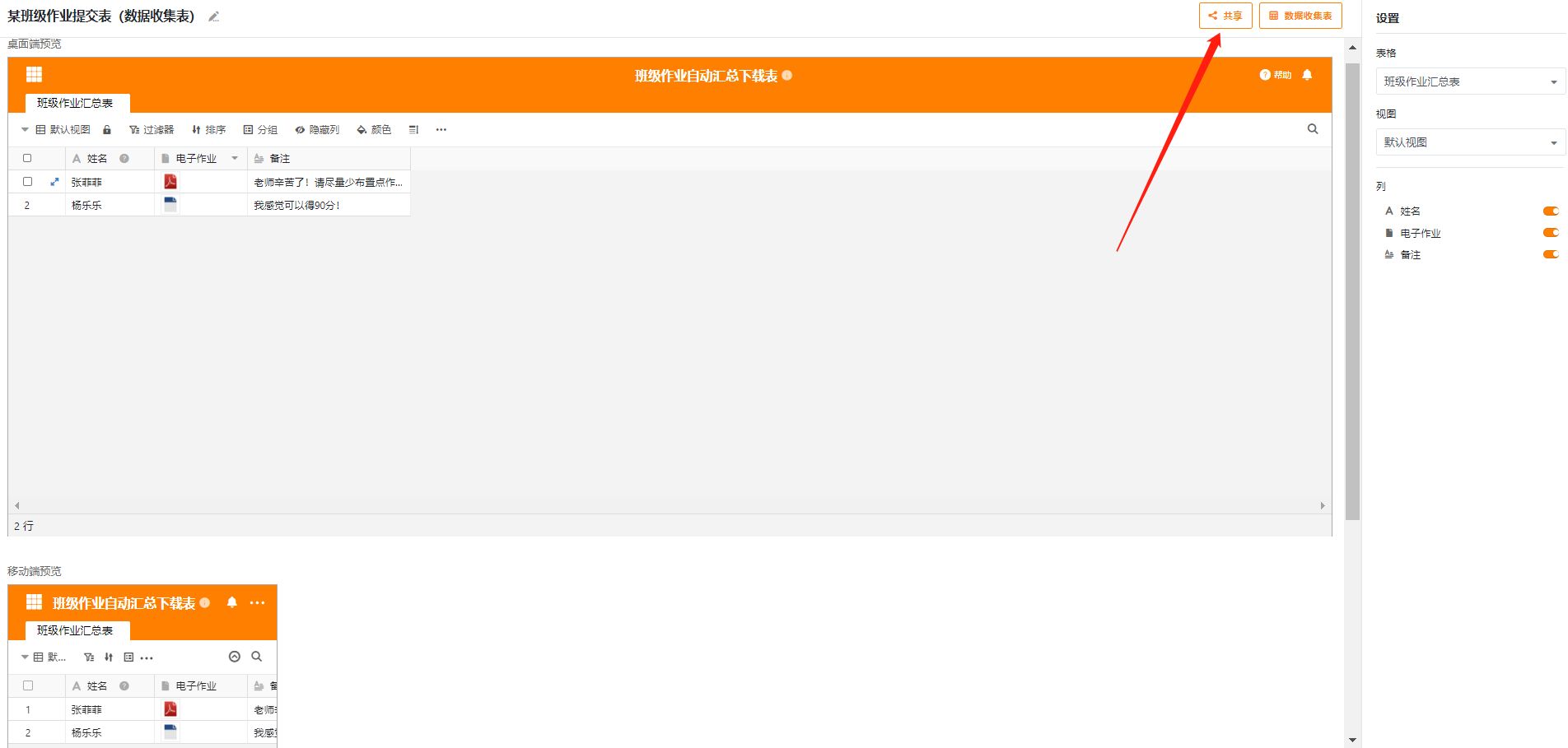 完成设置后,同样可把共享链接或二维码发给同学们。所有人填写的信息,就会实时自动汇总到表格里。