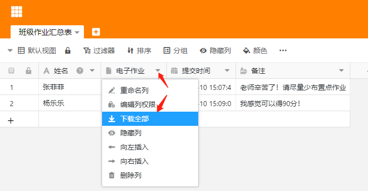 - 电子作业列:用了“文件”类型,可以添加PDF、PPT、Excel、Word、图片、压缩文件等各类型的文件。支持下载单个文件,也支持下载全部。