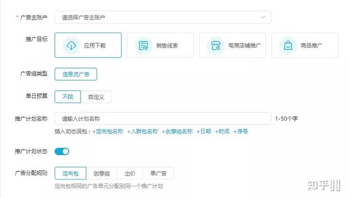根据业务需求选择对应的推广目标(应用下载、销售线索、商品推广等等),