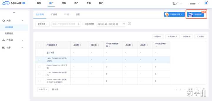AdsDesk可对多个广告投放账户进行跨账户创建广告,同时选择多个应用智能创建。