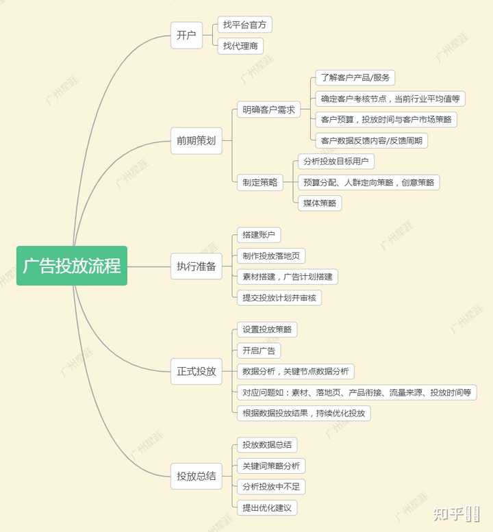 先通过一张思维导图来了解广告投放整体流程,加深对互联网广告投放的理解: