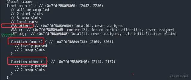 此外,带有草率的 eval 的函数上下文可能会静态地分配上下文槽,来存储要从内部函数(通过静态上下文地址)或通过 'eval'(动态上下文查找)访问的局部变量/函数。