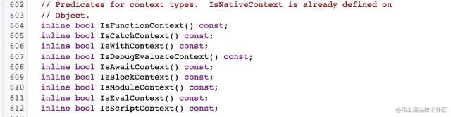 JSFunction 是成对的(上下文、函数代码),有时也称为闭包(注意:这里不要狭隘了,JSFunction和这个closures不是单纯指大家理解的js函数和闭包,这个JSFunction还包含了很多字节码、优化代码的相关操作等)。Context 对象常常用于表示函数上下文和动态推送“with”上下文(或 ECMA-262 中的“scope”)。