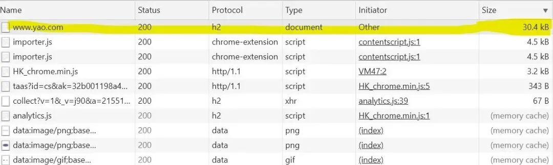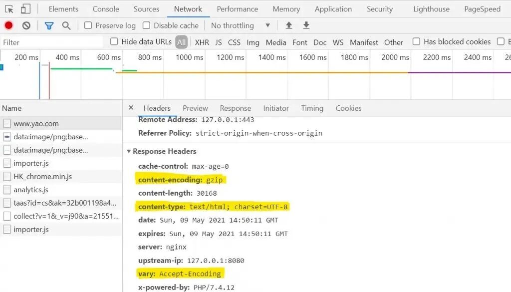 我们打开 Chrome 浏览器的开发者工具,然后查看 Network 面板查看我们的配置是否生效: