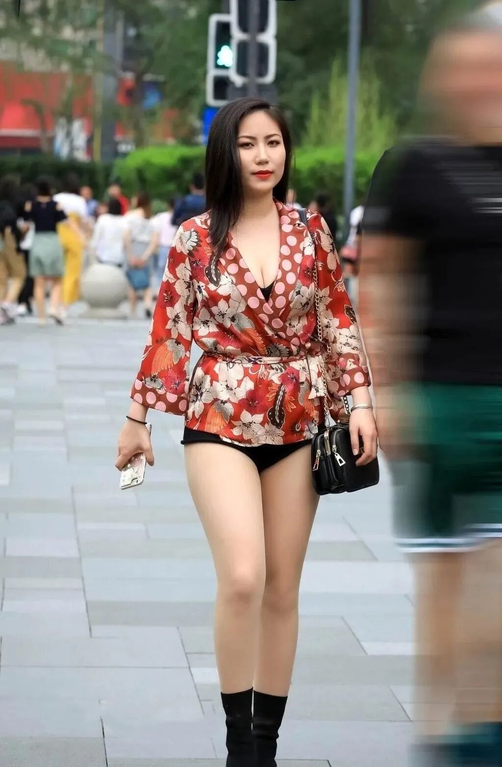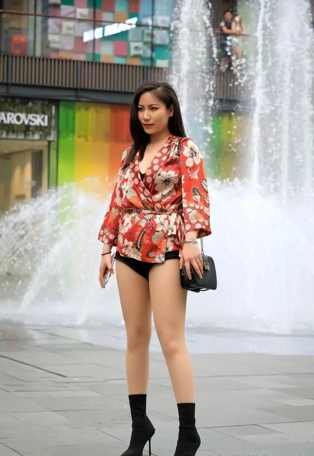 阳光穿透喷泉飞溅的水雾,绽放出绚丽夺目的光彩,轻轻地覆盖在她身着的红色印花上衣之上,似乎赋予了她一层闪耀的金色光晕。ME伫立在喷泉旁,眼神中透露出一丝迷离,凝视着远方,她的黑色长发如披肩般随风轻轻摇曳,构成了一幅引人入胜的画面。