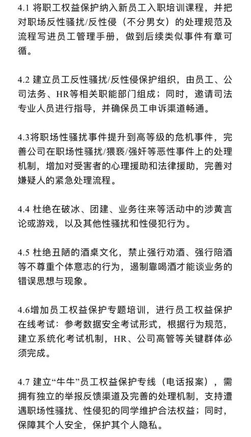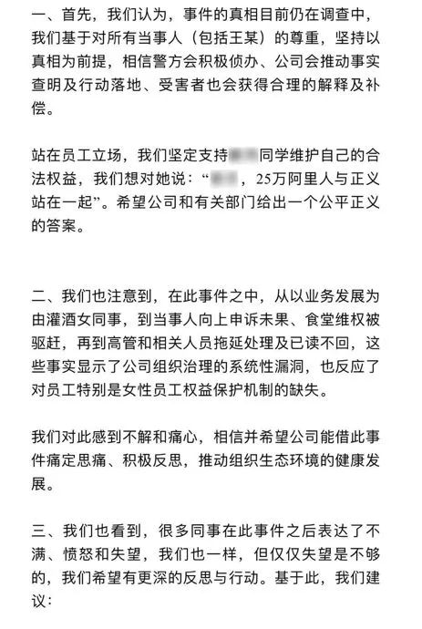 倡议书中还表示:案件正在侦办中,相信警方和公司会给出一个合理的解释和补偿。但是事件中,灌醉女同事、当事人申诉未果、食堂维权被驱赶、高官及相关人员拖延处理等,反映出了公司治理系统的漏洞和对女性员工权益保护的缺失。