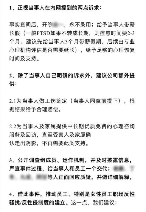 阿里人建议:开除涉事人员,永不录用;给予当事人带薪长假,给予足够的心理恢复时间和支持;为当事人做工伤鉴定,给予赔偿;为当事人提供中长期优质免费的心理咨询;公开调查组成员、运作机制,并及时披露信息;建立员工反性骚扰/反性侵保护组织等。
