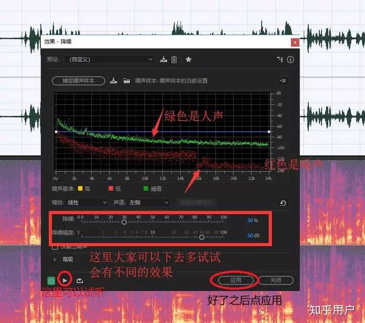 八:可以多试试框起来的那个数值,会有不同程度的降噪,我一般用这个就OK啦,调好过后点击应用。