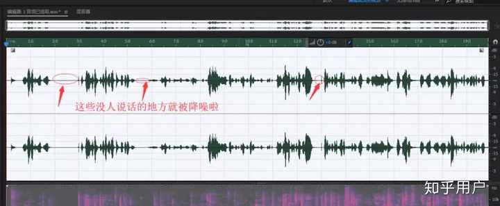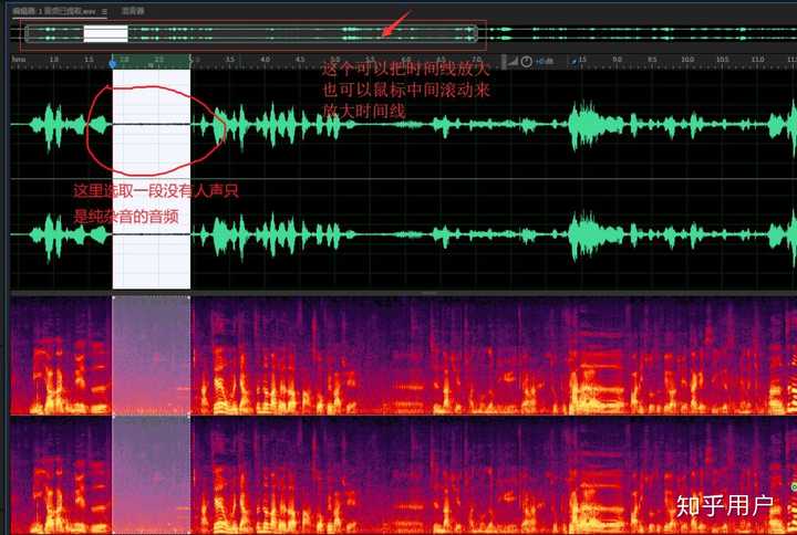 三:鼠标滚轮可以放大音频时间线,跟pr的时间线是 一样的,下图圈起的那一段平的波形就是杂音,没有人声(处理杂音的时候要选择没人说话的那一小段声音哦,不然人声会有损失。PS:怎么选中?就是鼠标左键按住不放拖动你觉得合适的)