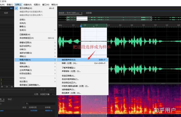 四:自己选好合适的一段噪音后,按照下图“捕捉噪声样本”快捷键是Shift+P(拿小本本记下)