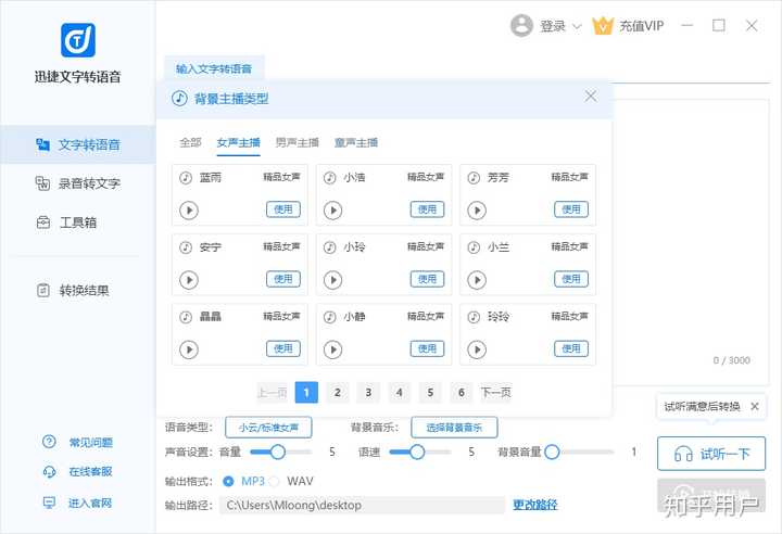 声音包括女声主播、男声主播、童声主播在内的数百种精品声音,你想要什么声音就可以将文字转换成什么声音,基本可以满足你对人声的各种需求。