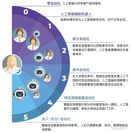 截至2019年12月,大多数市场现存的智能客服处于 Level 1 或 Level 2。Level 3“条件自动化”级别,目前被视为最新技术;Level 4“设计领域的全自动化”仍处于研发阶段;Level 5“类人(完全)自动化”是需要数年才能实现的长远未来。