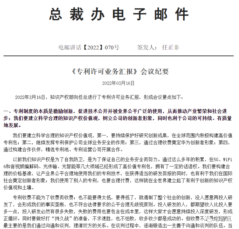 4月7日消息,昨日华为在心声社区公开了一则由任正非签发的《专利许可业务汇报》会议纪要。