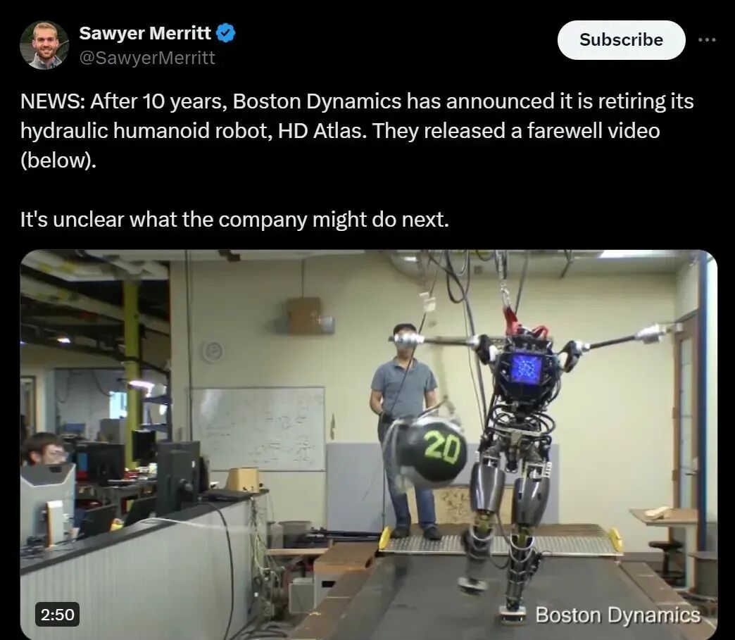然而这次的视频不是为了展示Atlas令人震惊的运动能力以及最新进展,而是为了回顾和告别