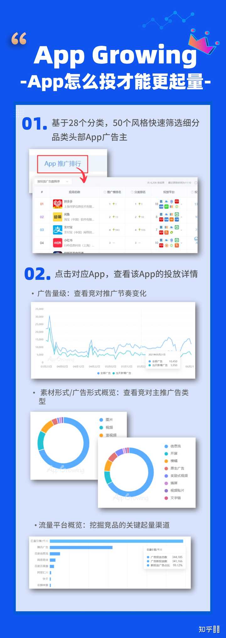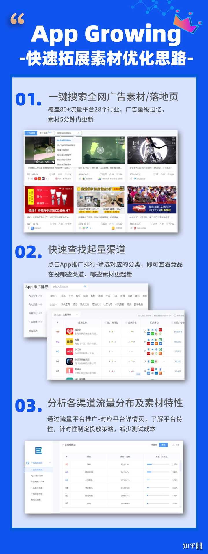 信息流广告变化节奏快,半数以上的素材生命周期甚至都不超过一周,及时把握市场素材动向也成为重中之重;追踪竞品推广情报,了解他们的渠道策略及推广节奏变化,才能更好地适应市场的变化,快速调整;在拓展新渠道方面,找到合适的渠道,快速了解渠道特性,减少前期的测试成本,也较为关键....App Growing 也 较好地解决了大家这方面的问题;