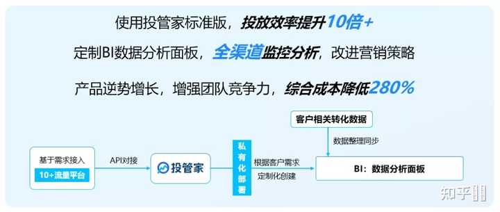 - 而对于推广总监、推广负责人。老板而言,既可以更快速地了解整体的投放数据,根据需求也可以按不同平台、不同团队、不同员工维度筛选,从而更好地评估投放人效比;定制版客户支持通过私有化部署(集成有米云BI平台),将投管家与CRM、ERP、电商销售等企业内部系统打通,实现从"线索"到"现金"数据互通,获得更深入的业务洞察,快速转化高价值商机。