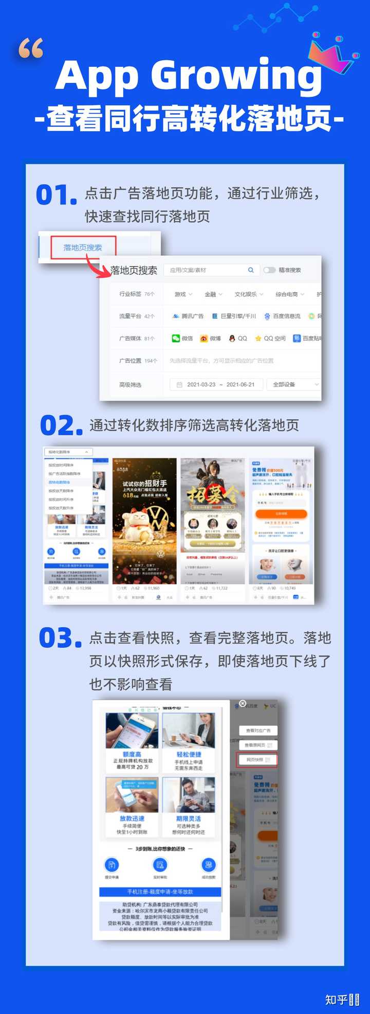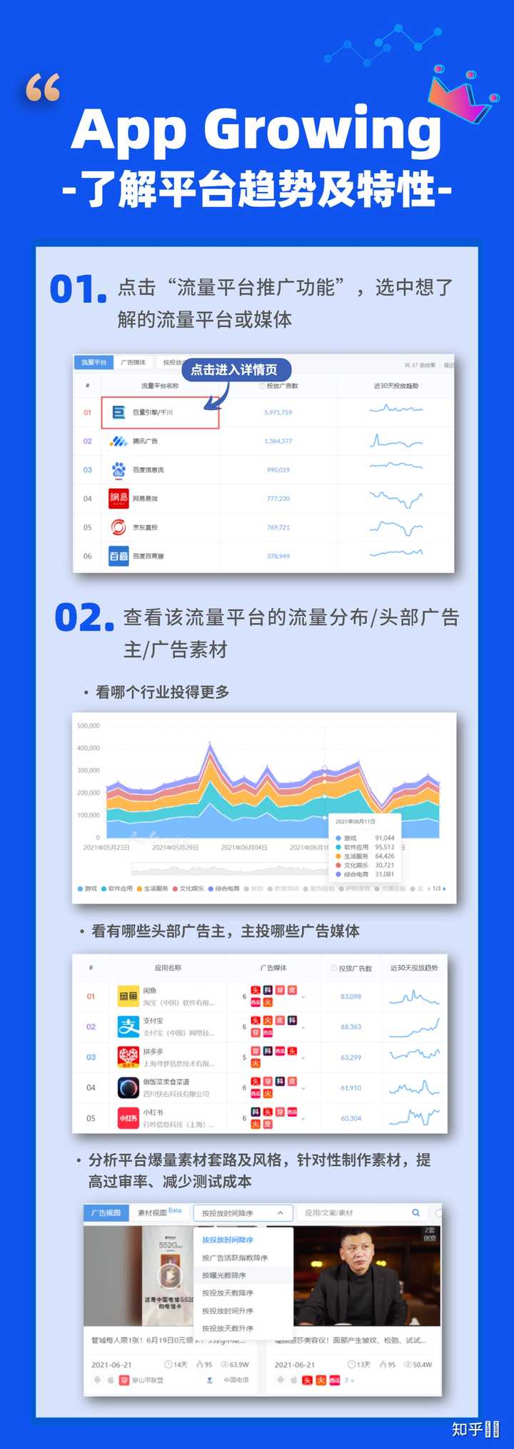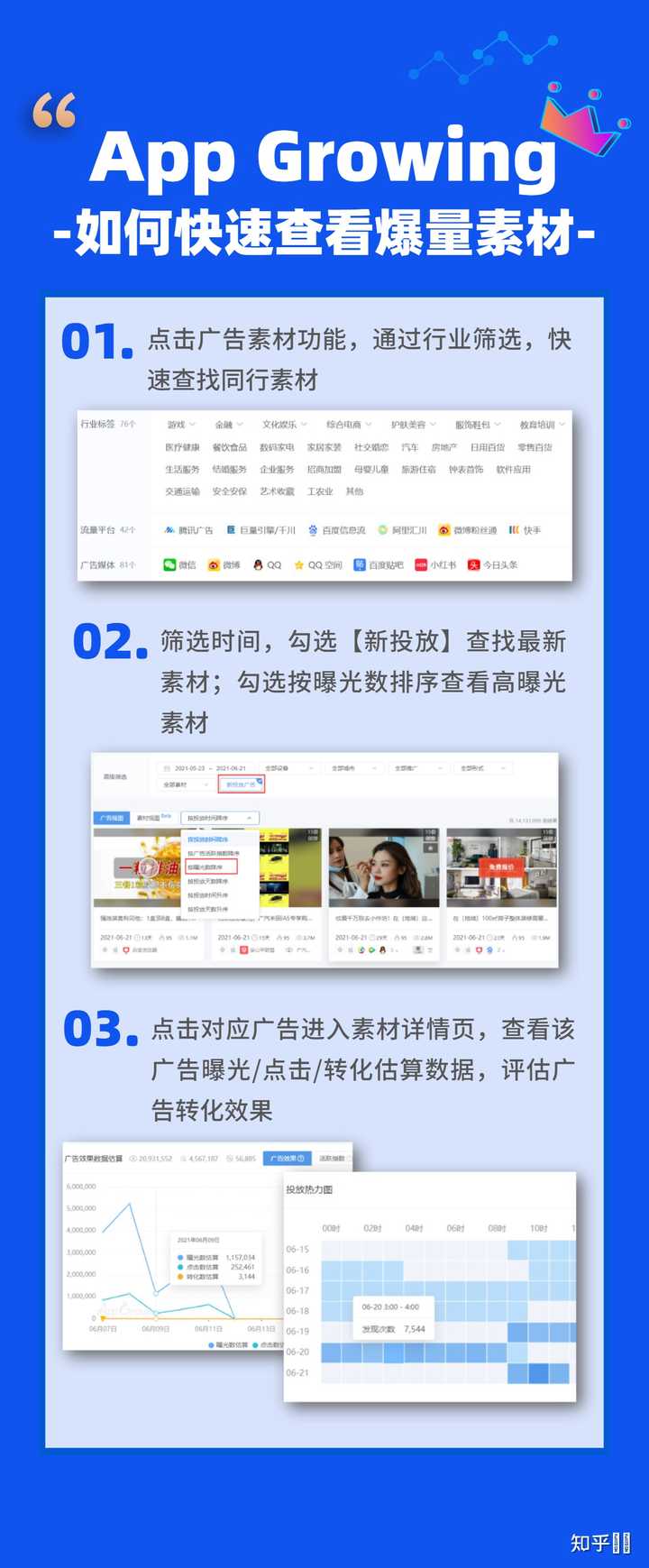 App Growing :着重解决的广告情报的问题,主要从广告素材追踪,竞品投放策略分析、流量平台趋势观察3方面,助力广告主、广告媒介、广告代理商快速掌握竞对,行业及整体市场的广告投放情报。先简单地介绍下 App Growing 相关应用场景;