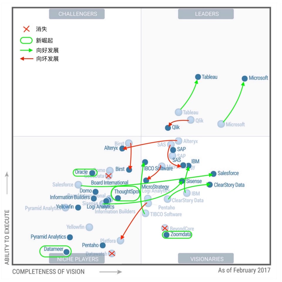 参考Gartner的这篇解读:深入解读《Gartner2017年商业智能和分析平台魔力象限报告》 - 知乎专栏