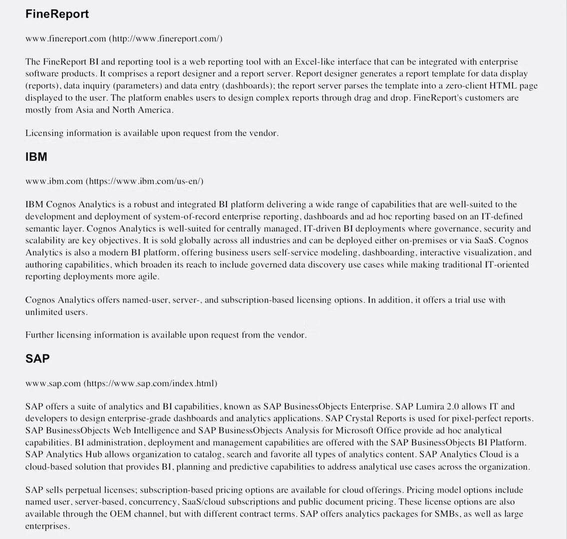 近几年,自助式BI大行其道,国内比较看好的商业智能品牌,个人认为是帆软。其也是2017年,国内唯一入选 Gartner BI领域指南的厂商,和IBM、SAP 并列。