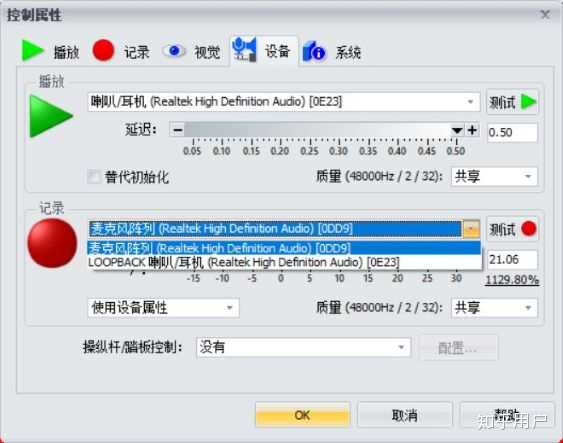 2.在“控制属性”面板中,打开“设备”选项卡。在“记录”选项下,选择“喇叭/耳机”,这样在录音时,就会自动选择使用电脑设备进行录音。同样的,内录的音频信号不会损失,录制质量也好。