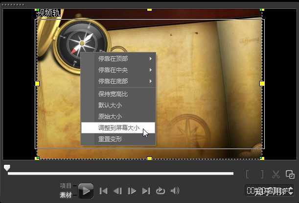 二、展开“选项”面板,选择“变形素材”复选框,在预览窗口中单击鼠标右键,执行【调整到屏幕大小】命令。