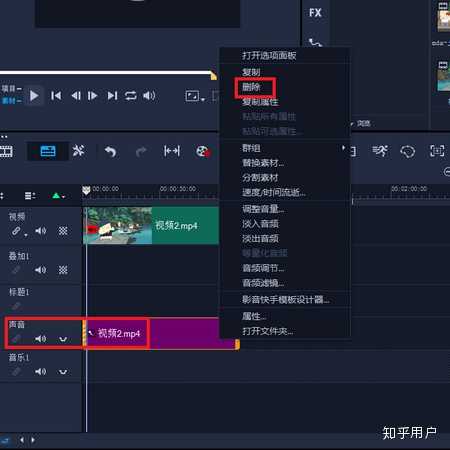 6.鼠标选中声音轨上视频2所分离出来的声音文件,单击右键,出来下拉菜单,单击菜单中的“删除”按钮,把分离出来的声音文件删除。