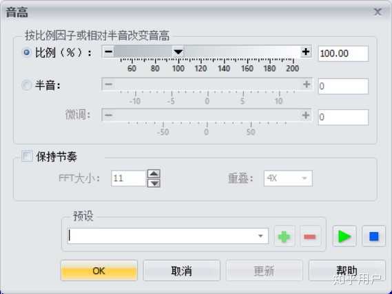 你只需要点击“效果—音高”,就可以打开“改变音高”的窗口。滑动音阶滑块,往左会降低音调,声音会变低沉,适合用来将女声转化为男声,反之往右则是适合将男声转化为女声