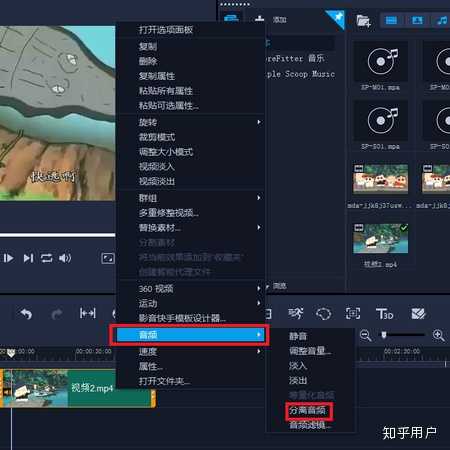 4.把鼠标光标放置在视频轨中,单击鼠标右键,出现下拉菜单,单击菜单中“音频”按钮,出现“分离音频”的选项,然后单击选中。