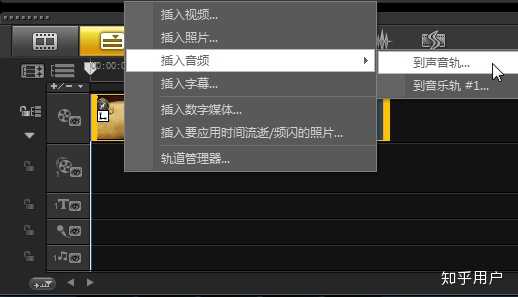 三、时间轴视图中单击鼠标右键,执行【插入音频】-【到声音轨】命令,可直接添加音频素材。