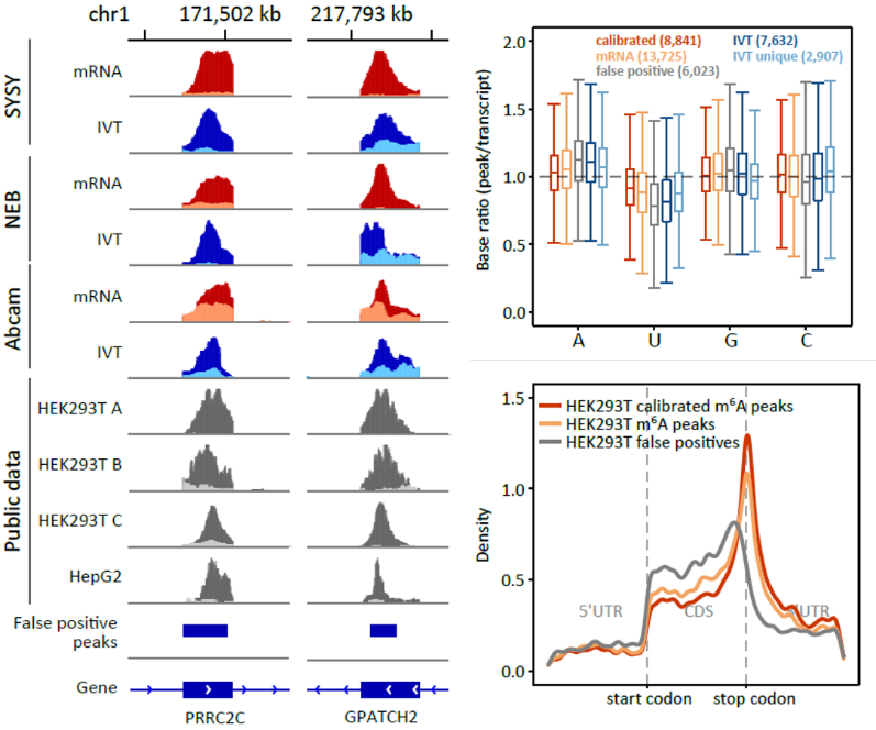 MeRIP-seq(或m6A-seq)是目前最常用的RNA修饰检测方法,被大范围地用在m6A相关研究中。该方法原理是用m6A特异性的抗体对片段化的RNA进行免疫沉淀反应,将含有m6A的片段富集出来进行测序。在研究中,我们同时对体外转录IVT RNA文库也进行MeRIP-seq,结果表明即使是对不含m6A修饰的IVT RNA文库,抗体依旧能够富集到大量RNA片段,并且这些富集的“peak”在已发表结果数据中重复出现,表明MeRIP-seq其实受到假阳性信号的严重干扰。分析IVT RNA中被富集的“peak”区域,发现这些区域所在的基因表达量较高且富含腺嘌呤。去除假阳性信号后,鉴定出来的修饰区域更准确(图3)。