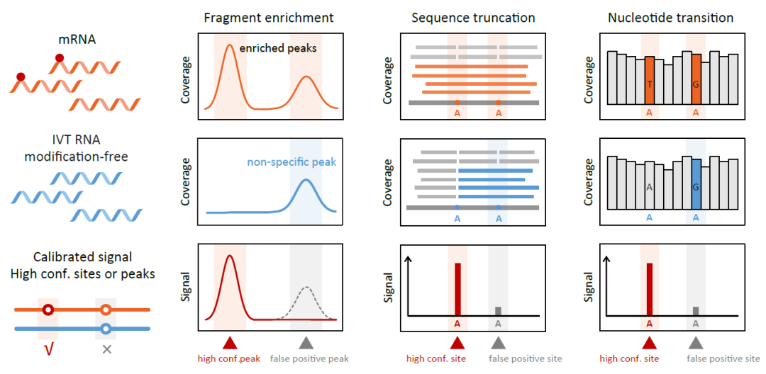 面对噪音较大的生物数据,引入对照来鉴别假阳性是经典的思路。在前人的研究中,为了提高现有RNA修饰检测方法的可信度,有时会利用负对照样本对结果进行校正。比如有研究使用敲除甲基转移酶(“writer”)的样品,或者利用去甲基化酶(”eraser”)在体外反应中获得去除修饰的样本,亦或是使用合成的无修饰的RNA oligo作为对照。然而这些负对照样本身存在较大的不足,比如体外反应很难完全去掉修饰位点,合成的RNA oligo只能代表部分序列等。因此,最好的负对照样本应该具有与内源转录组同样的序列和基因表达水平,但是并不含有修饰碱基的一套完整的人工转录组。本研究采用体外合成全转录组RNA (IVT RNA) 文库的方法构建了无修饰的RNA文库(图1),随后将其作为负对照用来校正现有的修饰检测方法。文中以两种最受关注的RNA修饰m6A和m5C作为代表,分别验证了该方法在三种典型研究场景中的有效性(图2)。