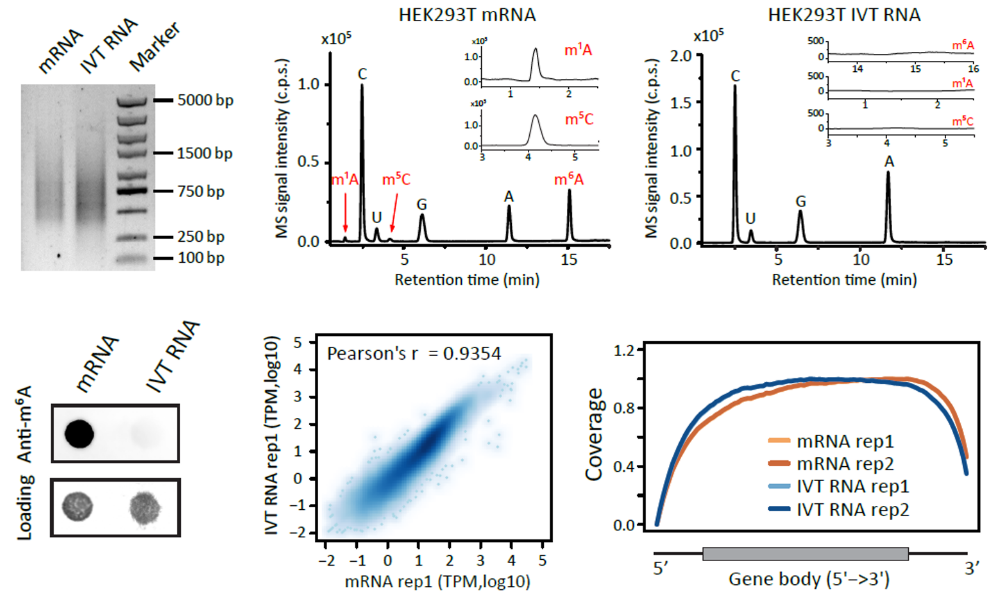 图1 体外合成RNA文库(IVT RNA)具有与内源转录组相似的表达量,但不含有修饰碱基