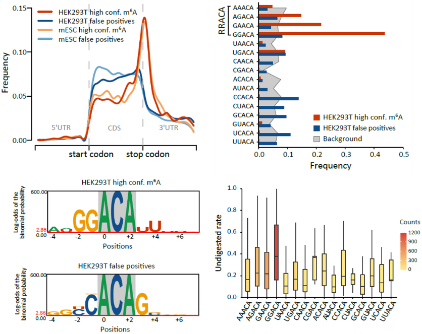m6A-REF-seq是一种借助m6A敏感内切核酸酶MazF来实现的m6A单碱基检测方法。该方法由本课题组和以色列魏茨曼科学研究学院Schraga Schwartz组在2019年分别独立发表【10,11】。在本研究中,我们将IVT RNA样本作为负对照进行m6A-REF-seq校正,发现确实存在大量假阳性位点。高精准度的m6A单碱基图谱也为领域提供了新的知识,如扩展motif序列,定量分布规律等,为进一步深入分析m6A的机制和功能创造了前提。通过对假阳性位点的深入分析,发现某些特定序列和RNA二级结构会干扰MazF酶切反应,是产生假阳性的主要原因(图4)。