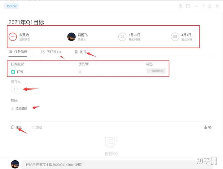 在新建任务的时候,你能将大项目拆解成一个个小任务并指派到个人,设置优先级、开始完成时间、参与人、任务状态等任务信息。并且可以通过附件、描述、评论、子任务、关联任务等形式补充任务信息,以实现任务信息一次传达,避免来回的问。