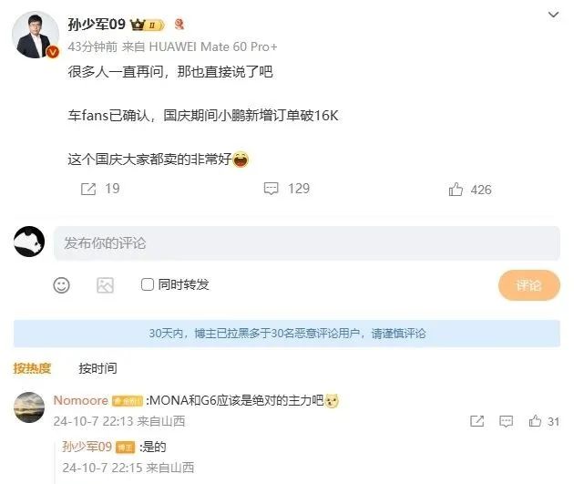 消息称国庆期间小鹏汽车新增订单破 1.6 万,MONA、G6 为主力车型