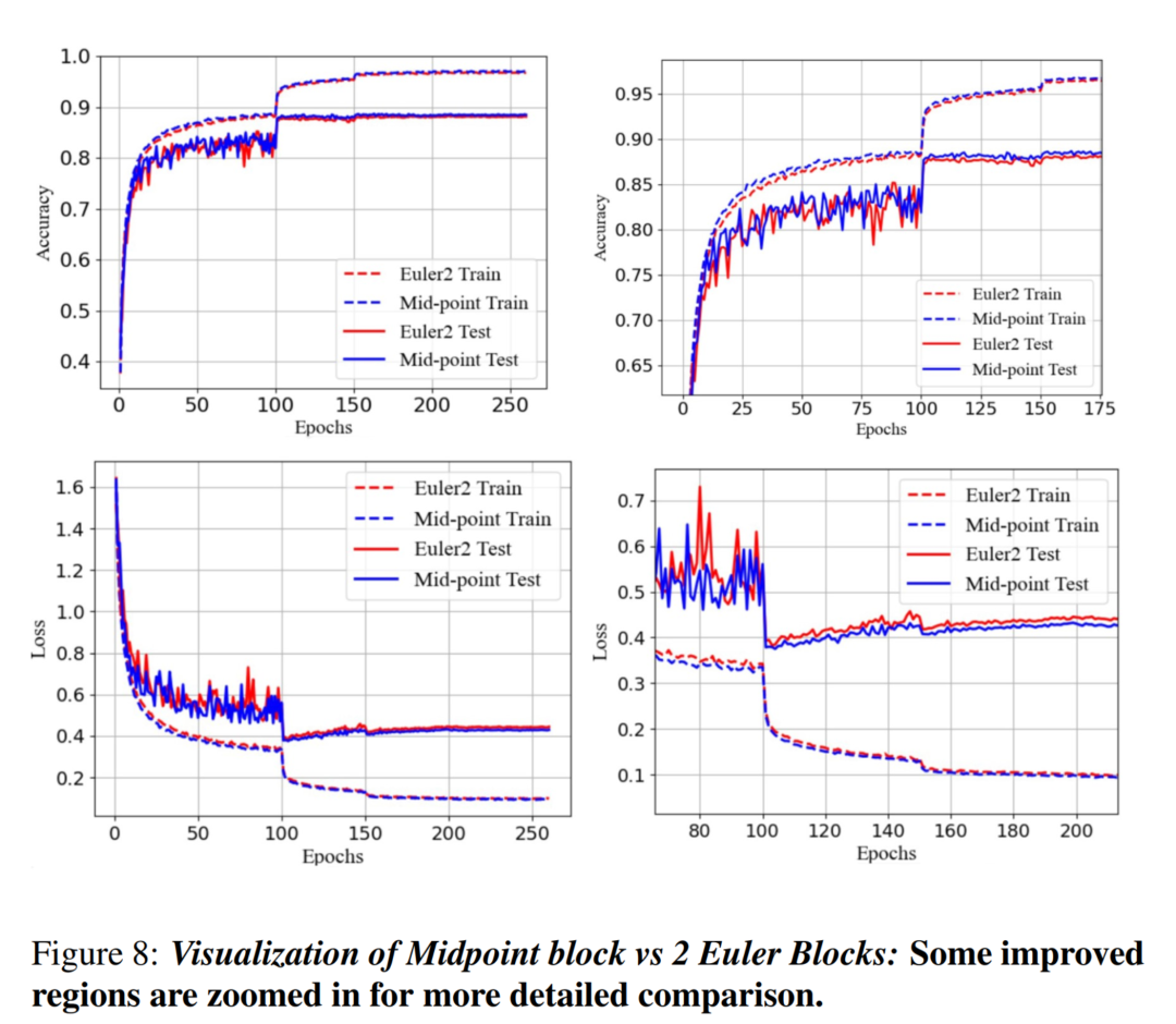 如图10所示,在相同的设置和参数下,采用高阶叠加方法,红线所代表的基线ResNet得到了明显的改善。作者注意到fixed RK8方法有改进的潜力。它在早期阶段高于RK-4。在Verner的设计中,还应保持一个比例因子h和误差来调整台阶侧。作者认为是固定步长导致RK-8退化到RK-4。